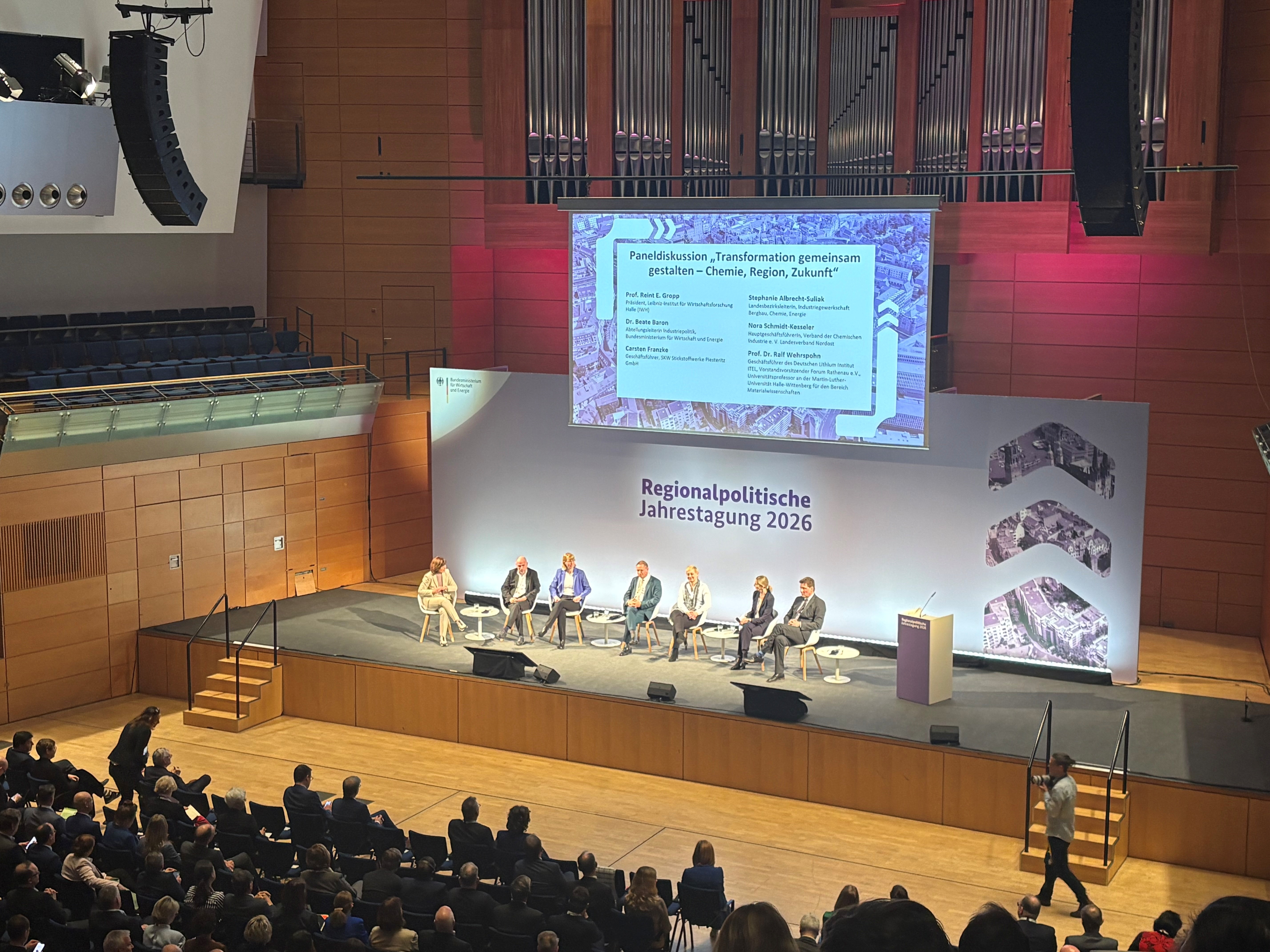 Am 2. und 3. März 2026 fand in Halle (Saale) die Regionalpolitische Jahrestagung des Bundesministeriums für Wirtschaft und Energie (BMWE) statt. Über 700 Teilnehmende aus Politik, Wirtschaft, Verwaltung, Wissenschaft, Verbänden und Gewerkschaften diskutierten dort über innovative Ansätze, wirksame Instrumente und bewährte Methoden einer zukunftsorientierten Regionalentwicklung. Auch für das Projekt »DekaRB – Dekarbonisierung für eine resiliente Wirtschaft beschleunigen« lieferte die Jahrestagung wichtige Impulse.